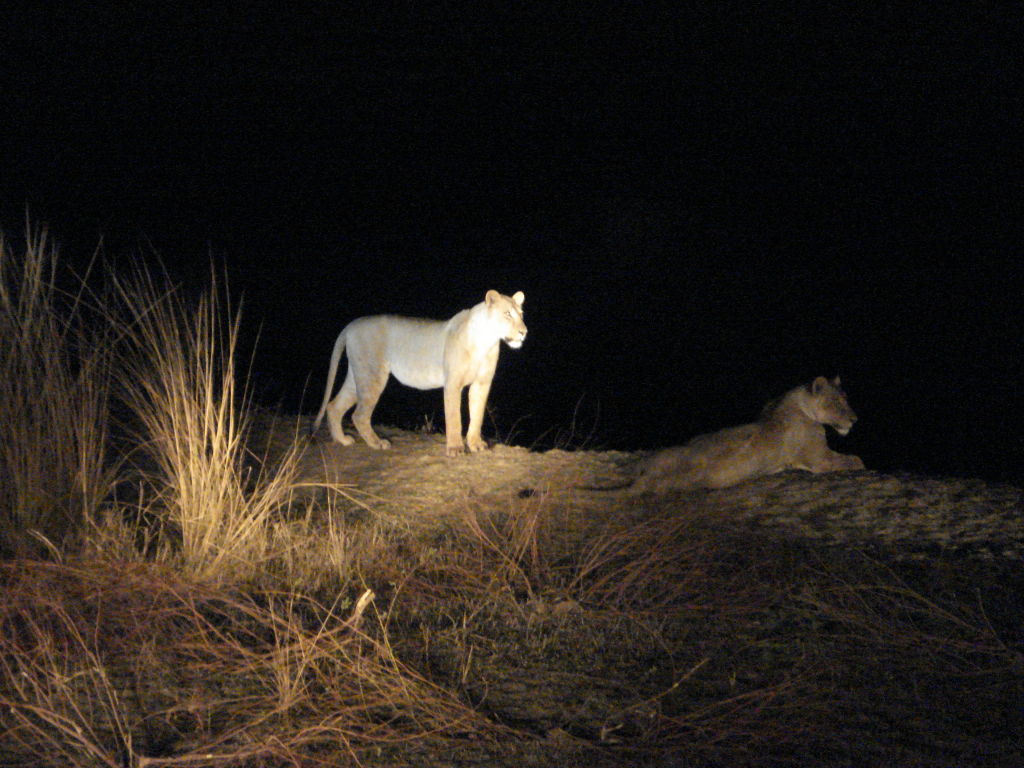 Met onze ongeoefende ogen zien we niet zo veel, maar de gids en de spotter zien in een tiende van een seconde aan de weerkaatsing van licht in de ogen welke dieren er in de bush zitten. Heel opmerkelijk. Er rijden meer jeeps rond en we zien wat meer drukte op een bepaalde plaats, een beetje boven de rivier. En jahoor, daar liggen 3 leeuwen, niet al te actief, maar ze zijn goed zichtbaar in de spotlights. Foto's maken gaat wel, maar is lastig. Het gaat om de ervaring.